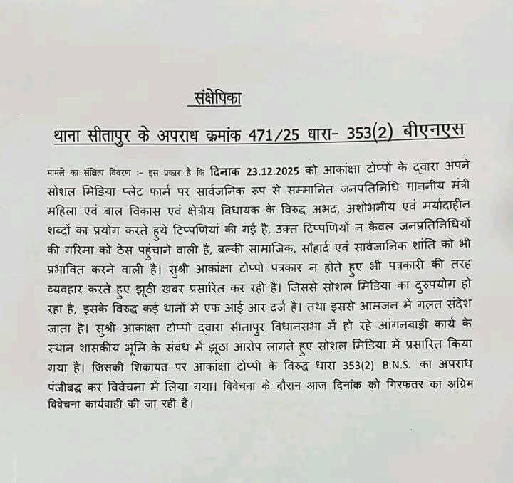 छत्तीसगढ़/सीतापुर :- सोशल मीडिया इन्फ्लूएंसर आकांक्षा टोप्पो की गिरफ़्तारी लोकतंत्र पर हमला।छत्तीसगढ़ पुलिस द्वारा सोशल मीडिया इन्फ्लूएंसर आकांक्षा टोप्पो की गिरफ़्तारी ने राज्य में अभिव्यक्ति की स्वतंत्रता और लोकतांत्रिक मूल्यों पर गंभीर सवाल खड़े कर दिए हैं।
