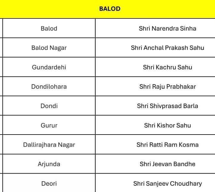 वंही जिला मुख्यालय बालोद के भीतर में ब्लाक कांग्रेस कमेटी के तौर पर नरेंद्र सिन्हा व बालोद नगर में अंचल प्रकाश साहू को अध्यक्ष बनाया गया है।इस कड़ी में गुंण्डदेही ब्लॉक से कचरू साहू एवं डौंडीलोहारा ब्लॉक से राजू प्रभाकर को जिम्मेदारी मिली है।