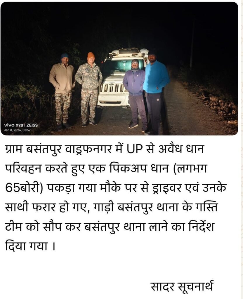 मिली जानकारी के अनुसार, 8 जनवरी 2026 की रात ग्राम बसंतपुर (नमोरी) में नायब तहसीलदार द्वारा उत्तर प्रदेश से तस्करी कर लाए जा रहे लगभग 65 बोरी अवैध धान से लदी एक बिना नंबर की पिकअप को पकड़ा गया था।