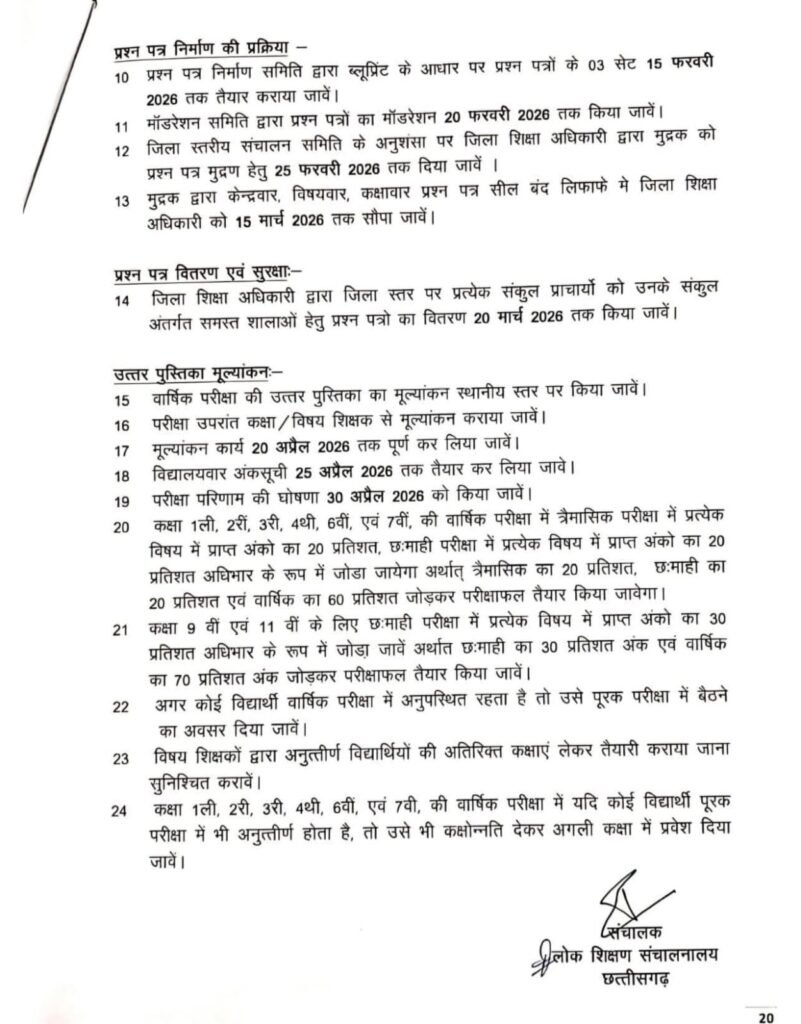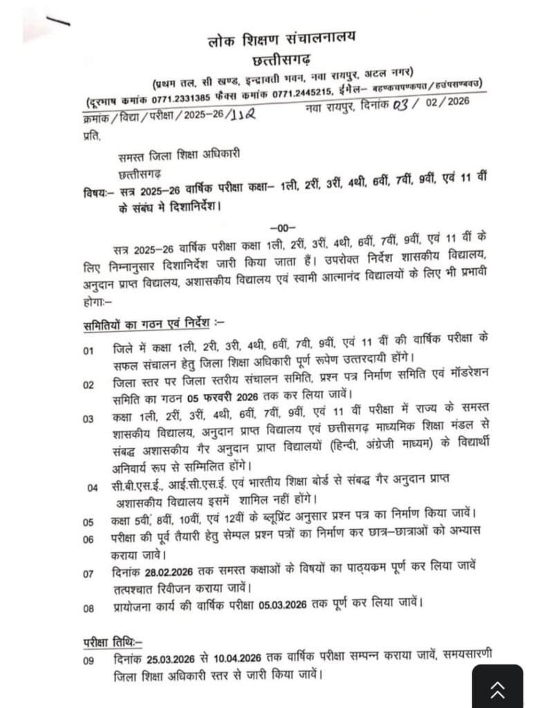 छत्तीसगढ़ शासन के लोक शिक्षण संचालनालय ने सत्र 2025-26 की वार्षिक परीक्षाओं को लेकर कड़े दिशा-निर्देश जारी करते हुए निजी एवं अशासकीय स्कूलों पर सख्ती बढ़ा दी है। जारी आदेश के मुताबिक अब प्रदेश के शासकीय, अनुदान प्राप्त और अशासकीय विद्यालयों के विद्यार्थियों को राज्य स्तर पर आयोजित वार्षिक परीक्षा में अनिवार्य रूप से शामिल होना होगा।