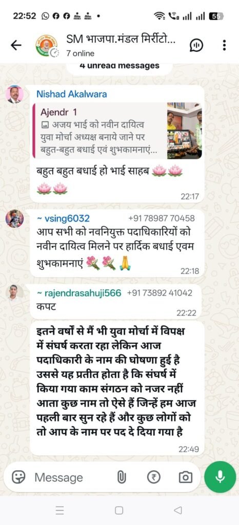भारतीय जनता पार्टी भी अपने कार्यकताओं को अपनी सबसे बडी पूंजी मानकर चलती है, लेकिन जिस तरह से बालोद युवा मोर्चा के भीतर में बड़े नेताओं के सुपुत्र रिश्तेदार और सुपुत्रों को जगह मिली है,उसे देखकर कार्यकर्ताओं मची हुई बवाल बहुत कुछ बात की ओर इशारा करती है।