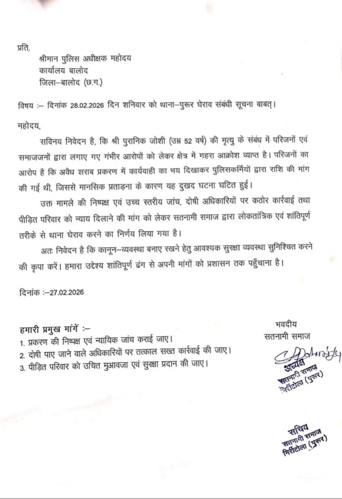 अब ऐसे में सतनामी समाज ने पुरानिक जोशी के मामले में आरोपी पुलिस कर्मियों के खिलाफ उचित कार्यवाही नहीं किये जाने को लेकर नेशनल हाईवे 30 यानि की ग्राम मिर्रीटोला (पुरूर ) के भीतर में दिनांक….आरोपी पुलिस कर्मचारियों के खिलाफ धरना प्रदर्शन करने का ऐलान किया है।
