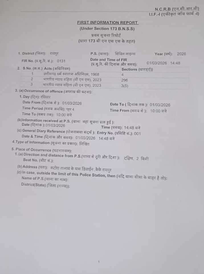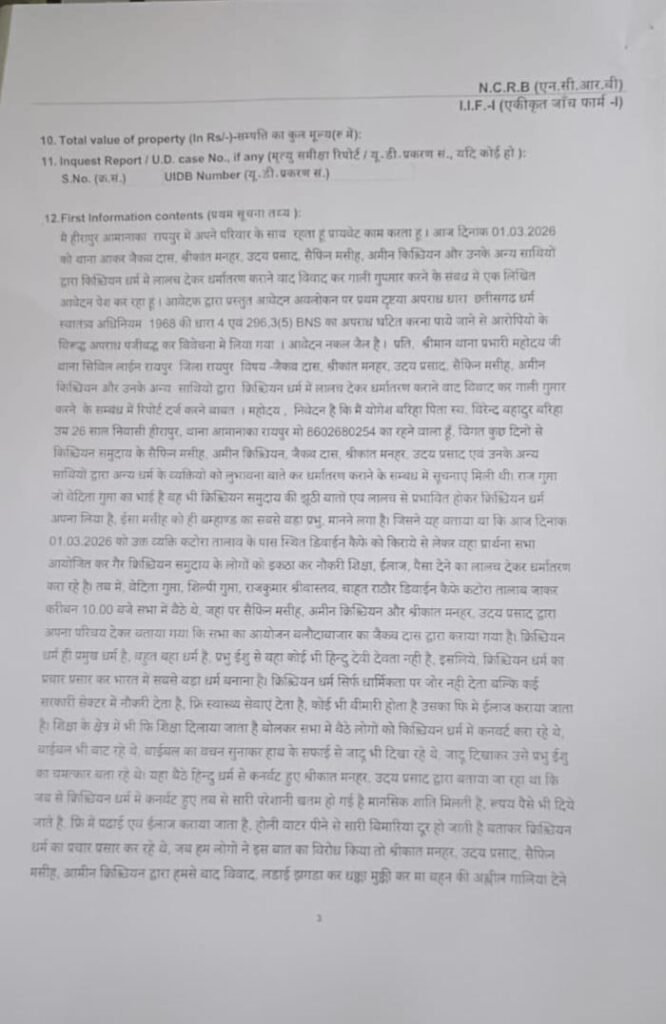 (Chhaatisgarh junction):- रायपुर जिले में कथित अवैध धर्मांतरण को लेकर पुलिस ने बड़ी कार्रवाई करते हुए FIR दर्ज की है। शिकायतकर्ता की लिखित शिकायत के आधार पर सिविल लाइंस थाना पुलिस ने छत्तीसगढ़ धर्म स्वतंत्रता अधिनियम 1968 और भारतीय न्याय संहिता (BNS) 2023 की विभिन्न धाराओं के तहत मामला पंजीबद्ध किया है।