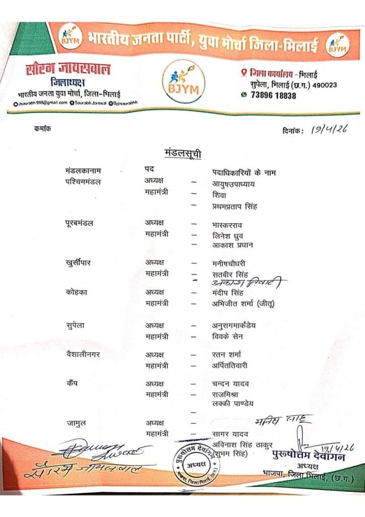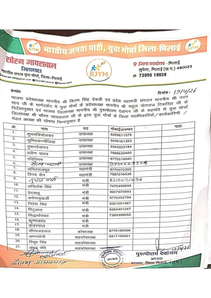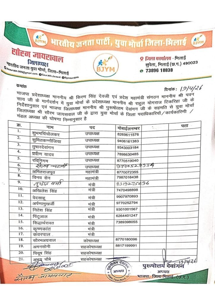भिलाई। भारतीय जनता युवा मोर्चा जिला भिलाई की नई कार्यकारिणी की घोषणा कर दी गई है। जिला अध्यक्ष सौरभ जायसवाल ने संगठन को मजबूत और सक्रिय बनाने के उद्देश्य से पदाधिकारियों की नियुक्ति की है।